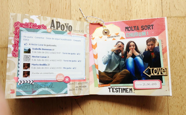 Debajo de la foto de arriba a la derecha de la segunda página, puse otra foto del mismo momento con un tab encima para poderla sacar fácilmente y sobretodo recordar que hay algo debajo! Puse dos fotos, porque básicamente no me podía decidir por una! Me gustaba mucho haber captado ese momento de atención de mis dos amigas. Parece que habláramos de algo serio y todo!
